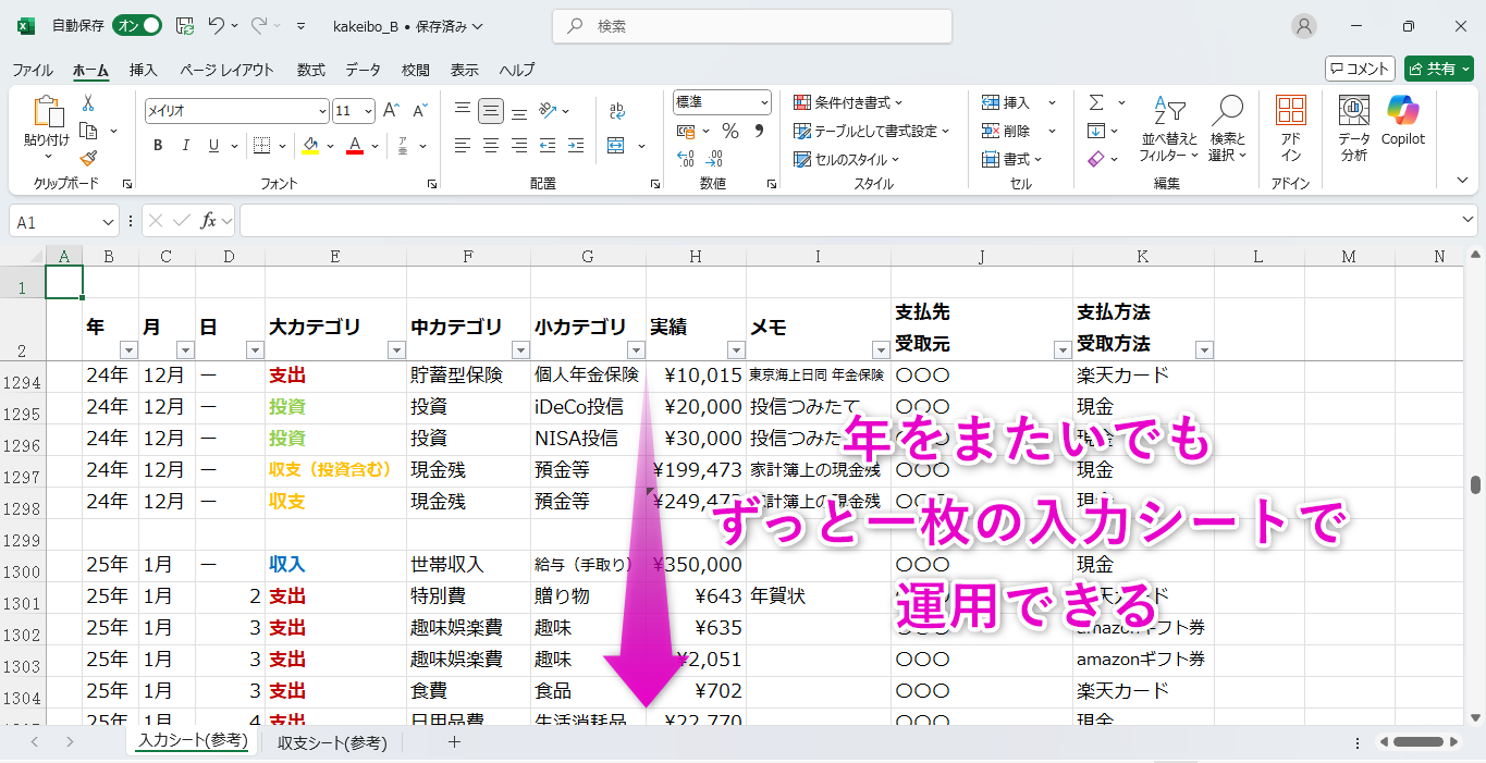 そのため、入力シートが1枚あれば一生分の家計データが入力できてしまうわけです。