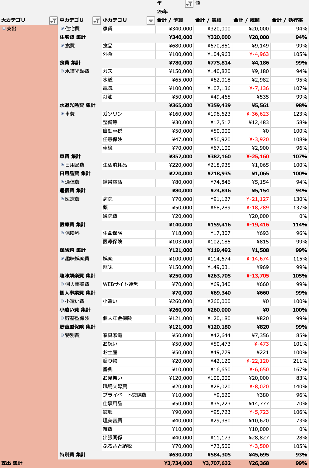 以下は、我家が予算シートと呼んでいるもので、年間単位での予算・実績・残額・執行率をまとめた一覧表です。