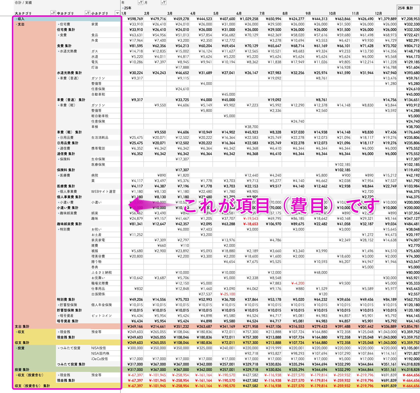 これは収支シートと呼んでいる集計表なのですが、赤枠で囲ってある部分が我家で設定している項目になります(2025年時点)。