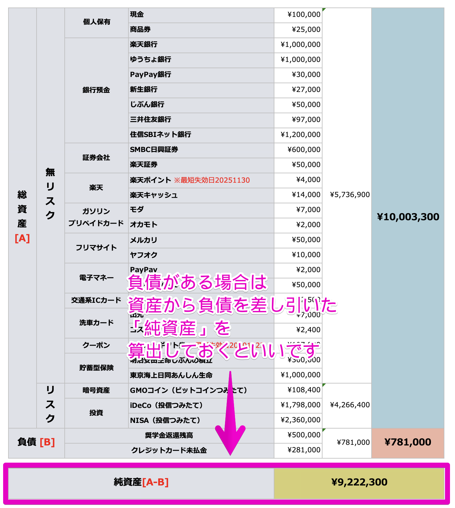 なぜなら、負債がある場合は、負債額もしっかり見える化しておかないと正確な資産の状況を把握できないからです。