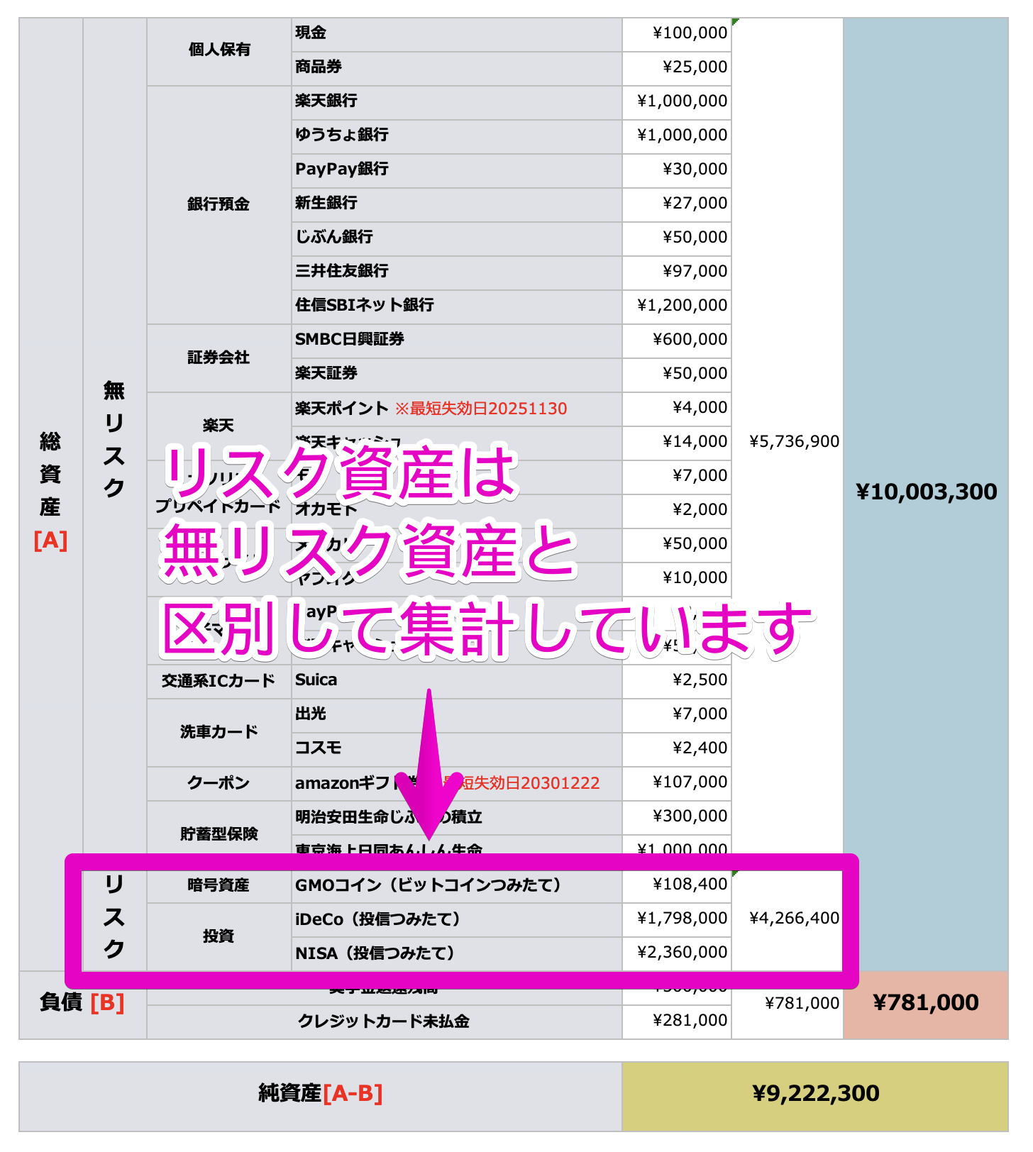 区別する理由としては、総資産のうち、資産運用に回しているお金の割合(リスク資産割合)を常に把握しておきたいからです。