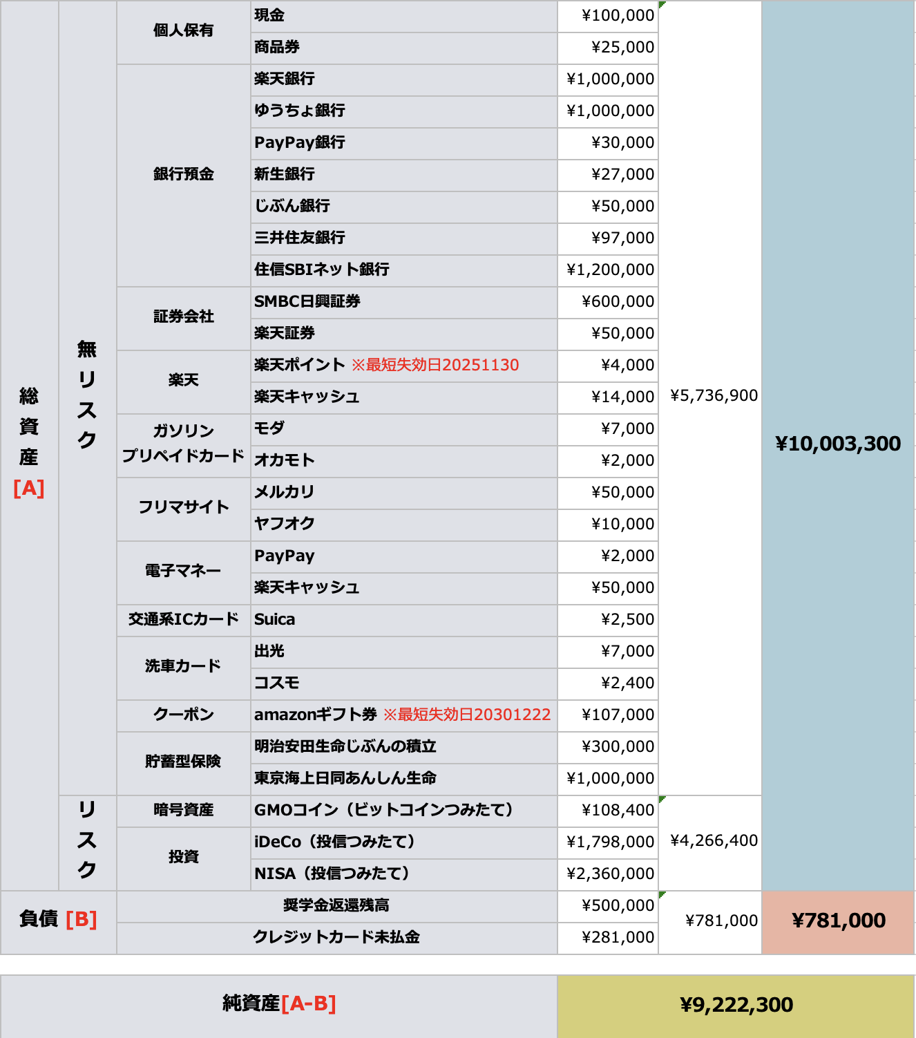 ちなみに我家は、クレジットカードの未払金についても負債として扱っていますが、これを負債として扱うかどうかについてはお好みです。