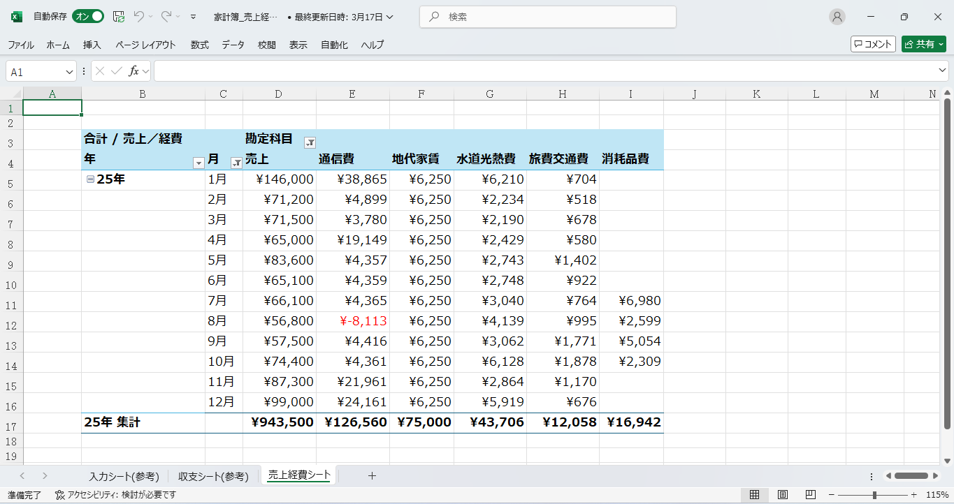 収支シートは、入力シートに打ち込んだ収支データを集計・一覧表化するためのツールです。