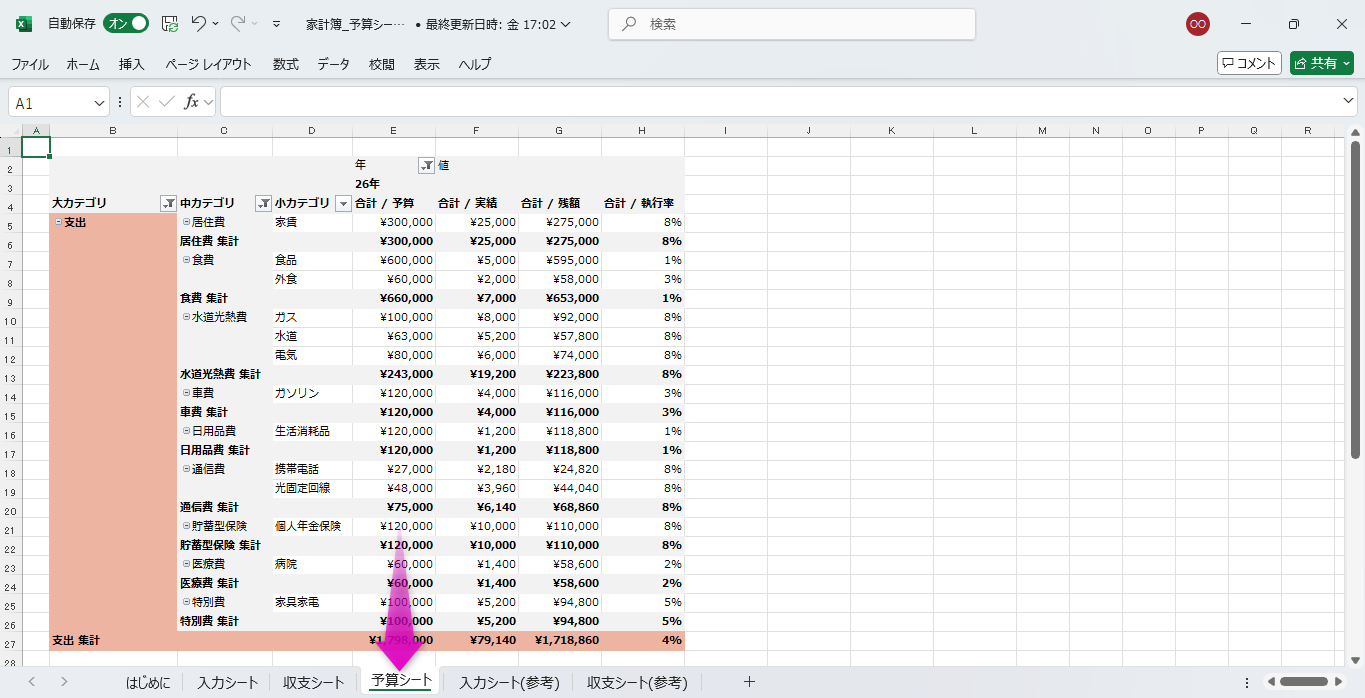 予算シートもピボットテーブルを使って作成しており、更新操作をすると、入力シートに入力したデータをもとに自動集計・自動反映されます。