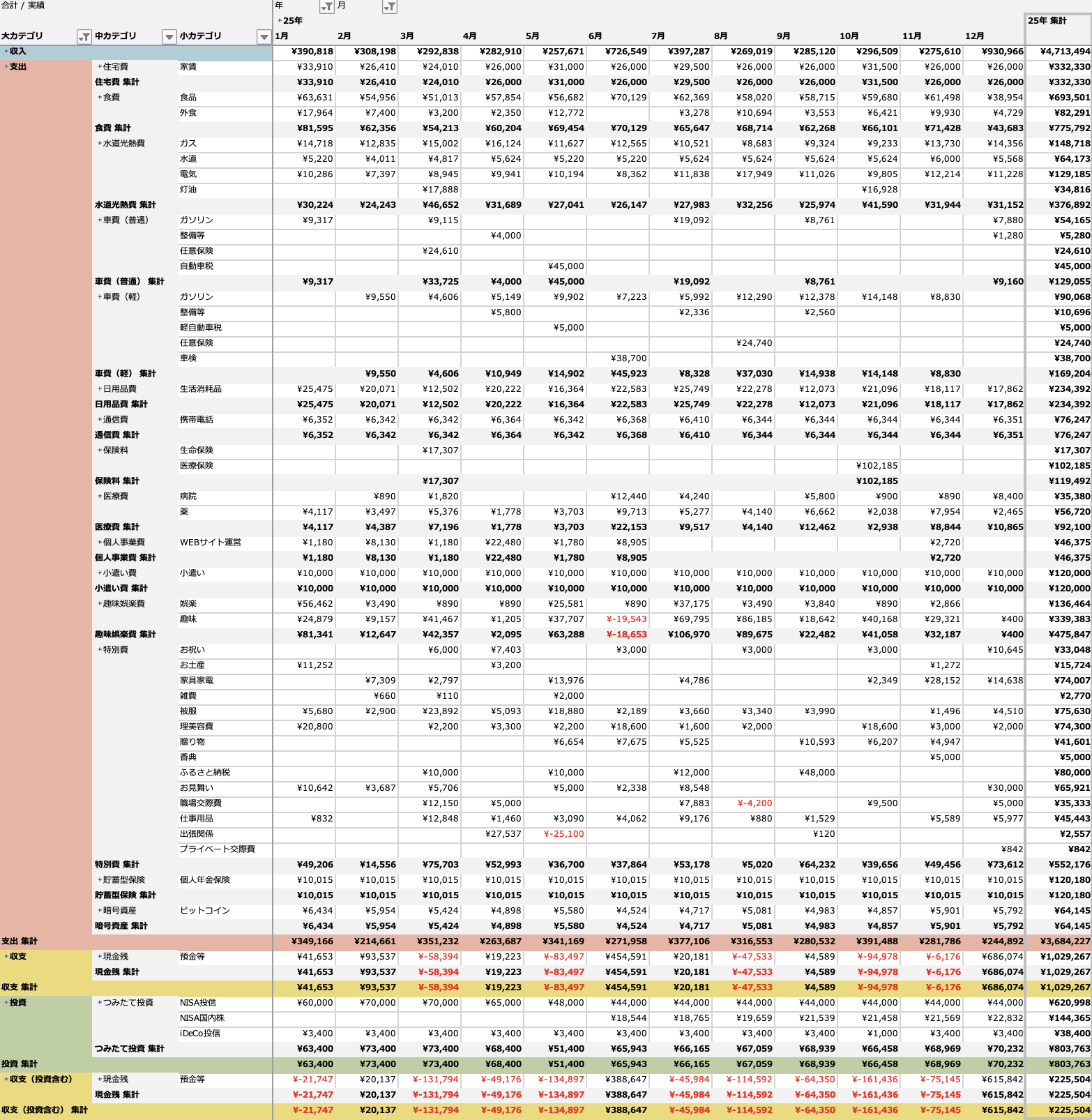 ちなみに、これが我家のエクセル家計簿です。一年分の収入・支出・収支などをまとめた集計表が出来上がります。
