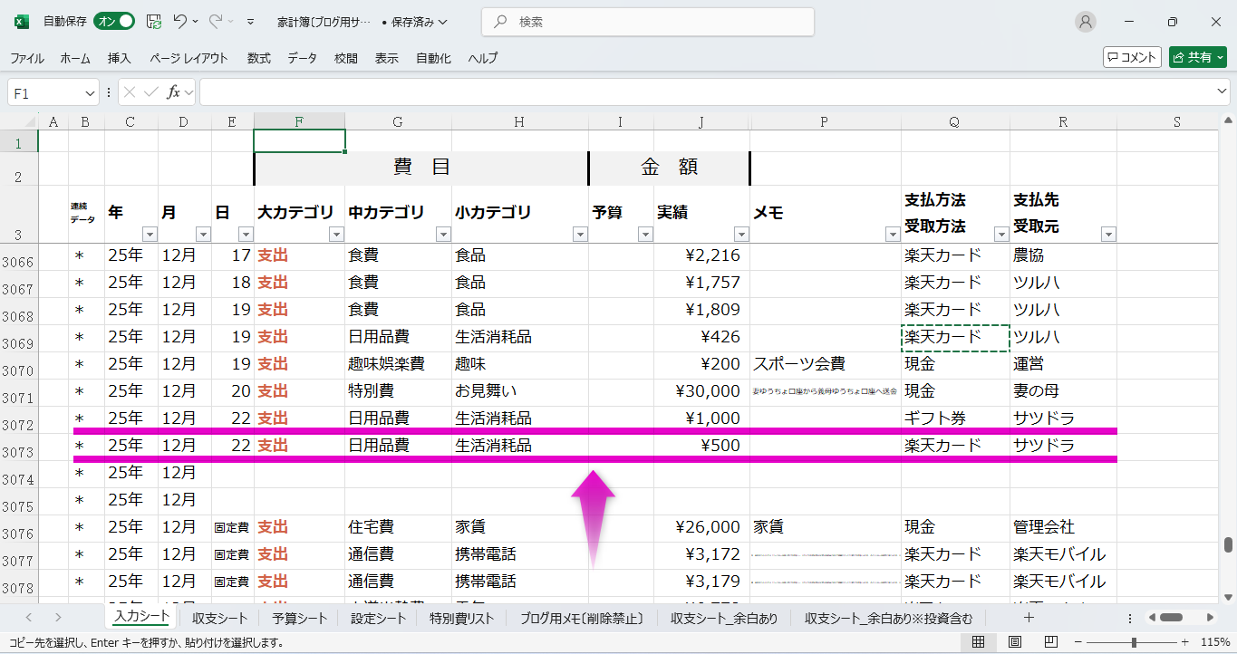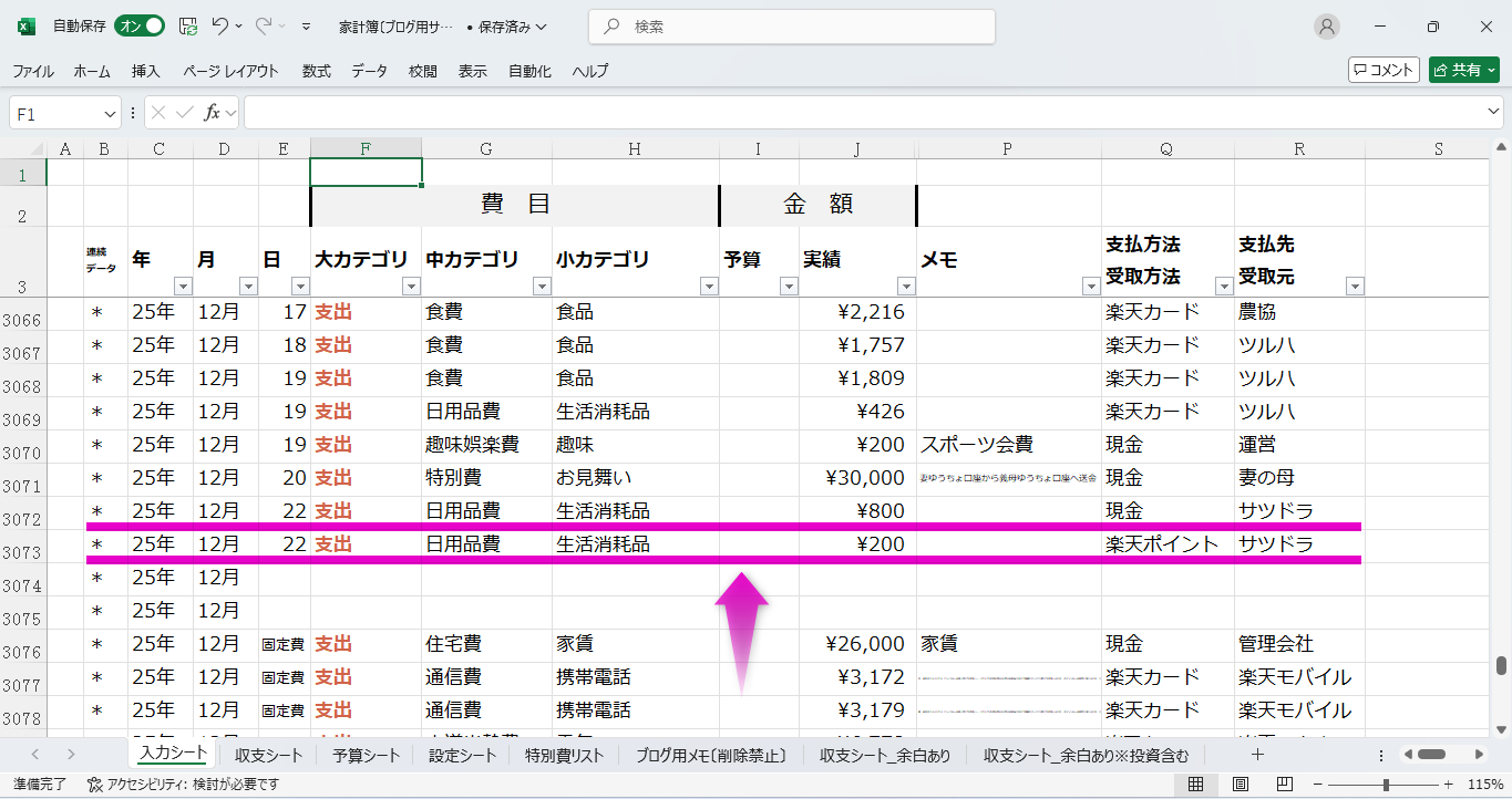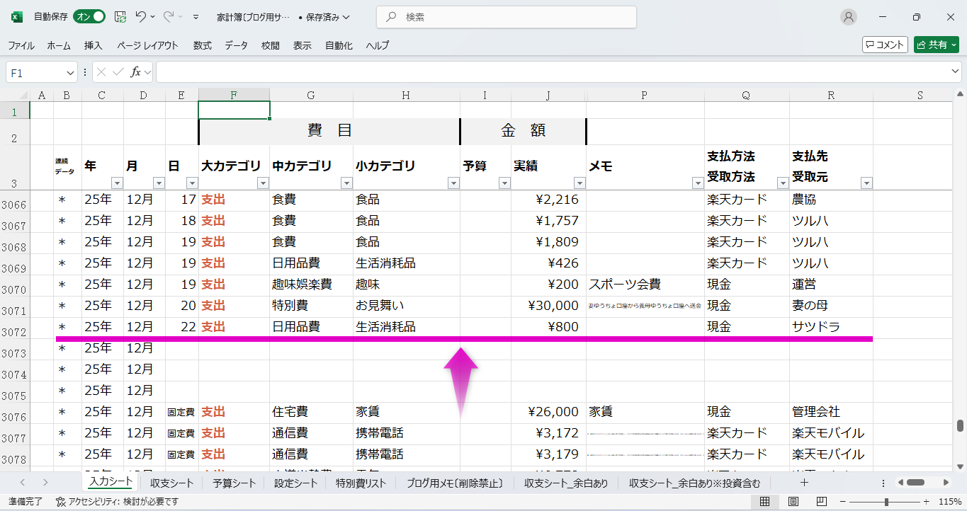 さきほども書きましたが、エクセル家計簿の良いところは、入力をとにかく効率化できることです。