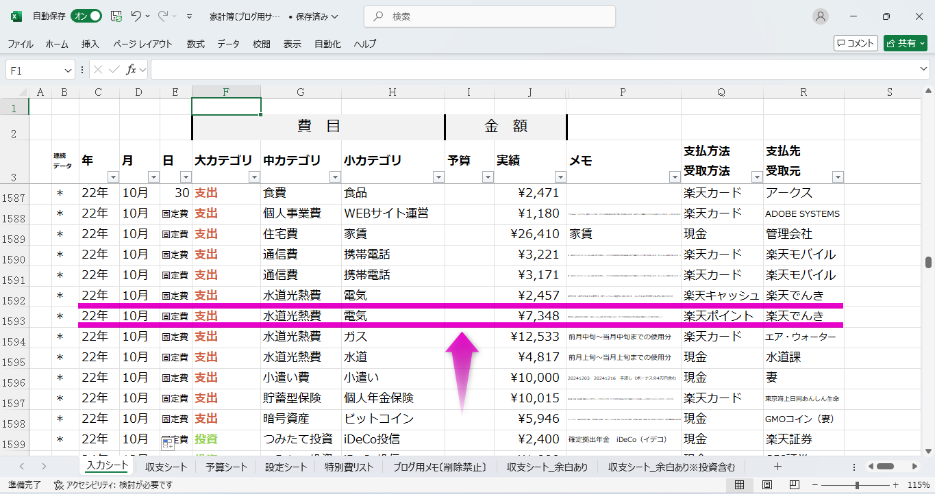 ちなみにさきほどの我家の楽天でんきの支払いは、このように記録しました。