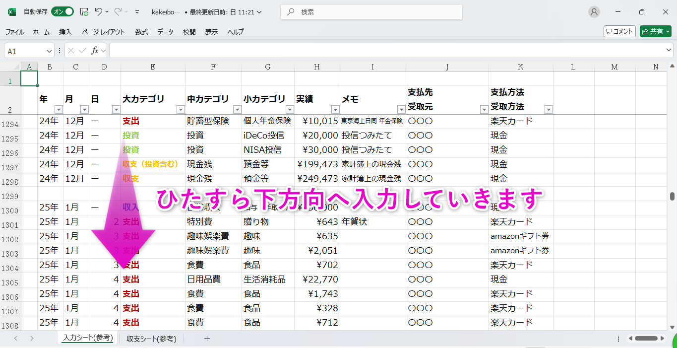 収入や支出などのすべての家計データを、1行に1データずつ、下方向にひたすら追加し続けるだけです(^-^)