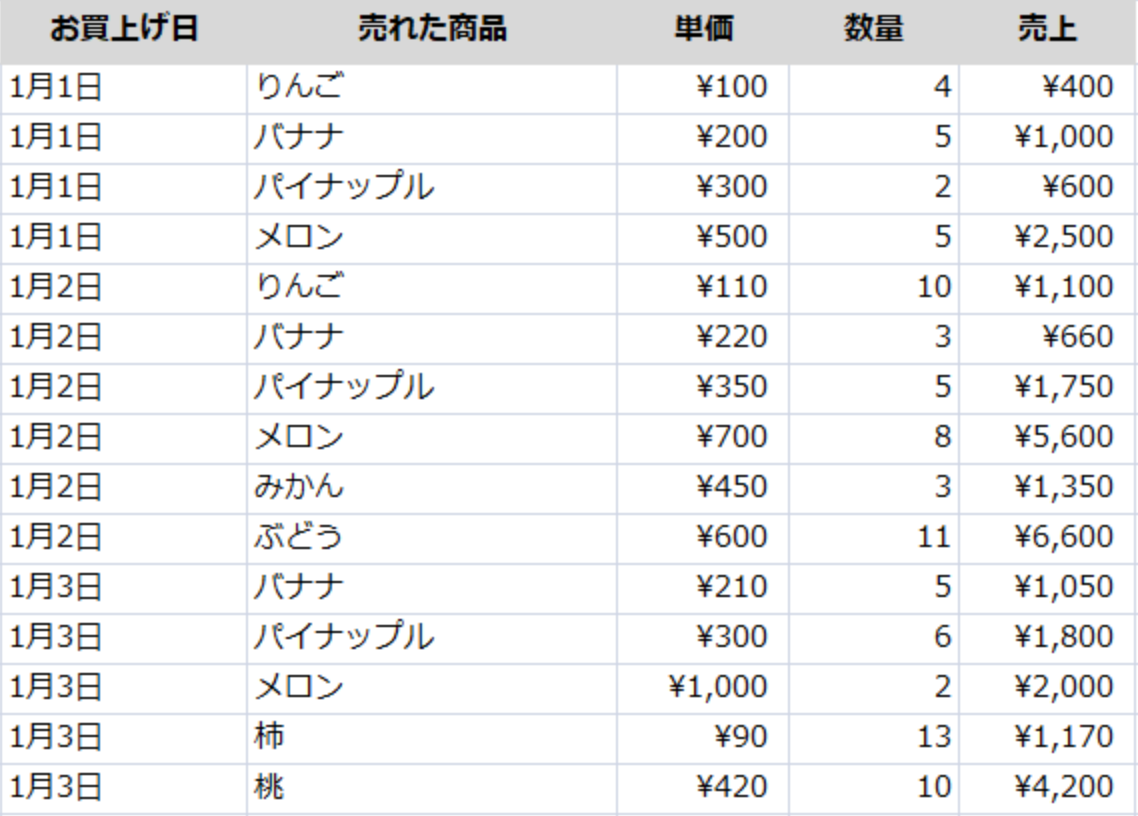 たとえば、くだもの屋さんが日々の売上記録をエクセルでこんなふうにまとめていたとします。